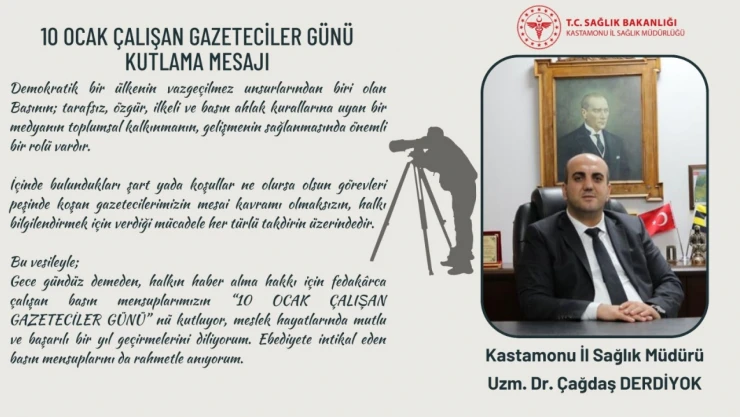 Kastamonu İl Sağlık Müdürü Uzm. Dr. Çağdaş Derdiyok, bir kutlama mesajı yayınlayarak 10 Ocak Çalışan Gazeteciler Günü'nü kutladı.