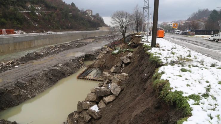 Abdurrahmanpaşa Caddesi Çatalkaya Sanayi Sitesi mevkisindeki heyelanda, dere yatağında bulunan istinat duvarları çöktü.
