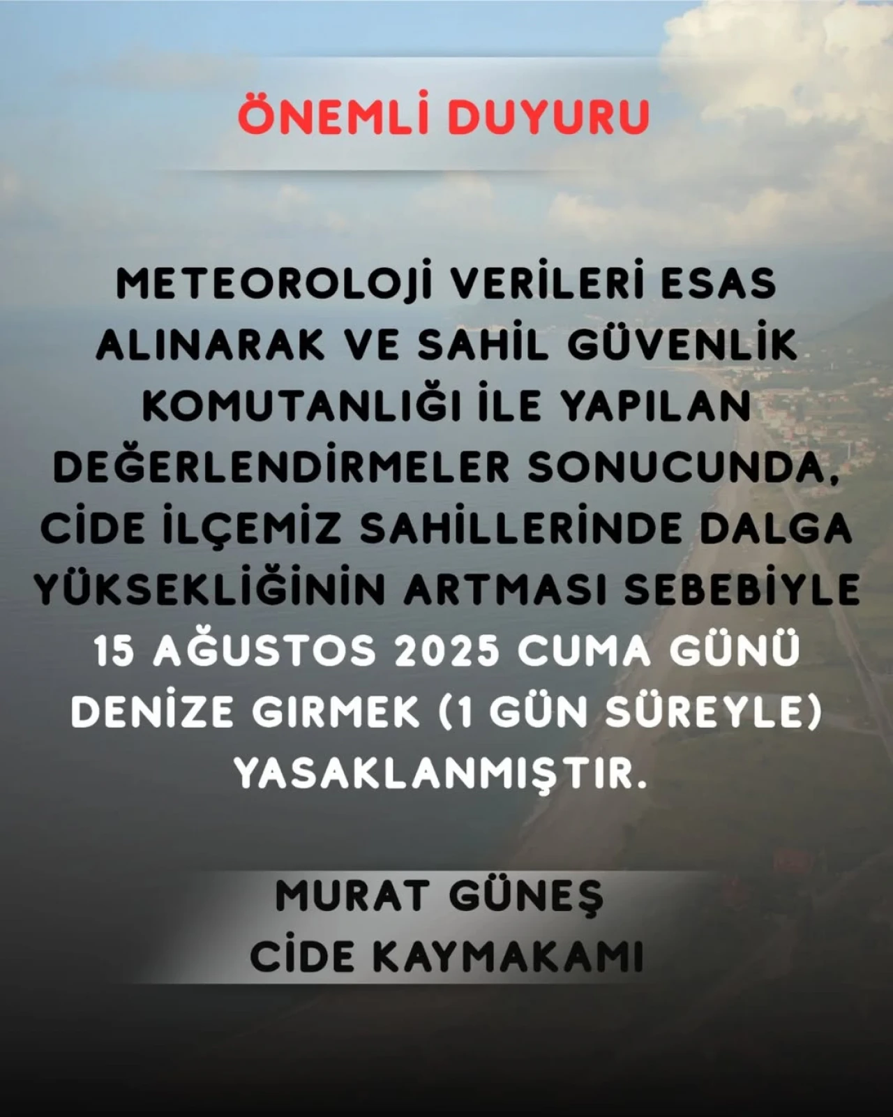 Cide Kaymakamı Murat Güneş, dalga yüksekliğinin artması sebebiyle alınan yasağın bir gün süreyle geçerli olacağını belirtti.