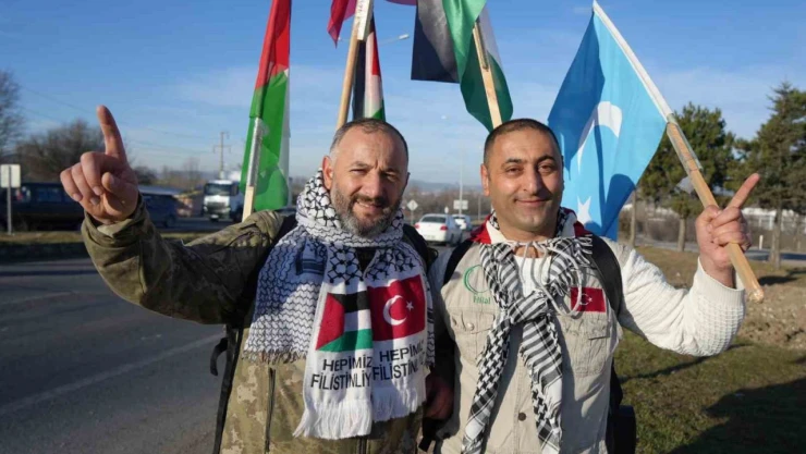 İsrail’in Gazze’ye yönelik saldırıları devam ederken Fatih Yavuz ve İsmail Tiryaki isimli 2 arkadaş Filistin’e destek yürüyüşü başlattı.