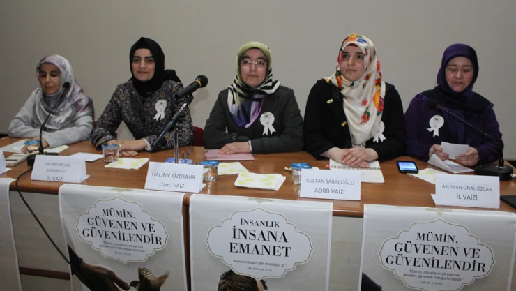 Kutlu Doğum Haftası etkinlikleri kapsamında İl Müftülüğü tarafından kadınlara özel 'Hz. Peygamber ve Güven' konulu panel Halk Eğitim Merkez'inde düzenlendi. Panelistler İl Müftülüğü Vaizlerinden Asuman Ünal Özcan, Sultan Saraçoğlu, Halime Özdemir, Fatma Melek Karabulut, Şükran Çakır toplumda güven konusunu gelen dinleyicilere aktardılar. 'DİNİMİZİN TEMELİ BİRLİKTİR' Birlik ve beraber ve huzurlu yaşamak konu hakkında sunum yapan...