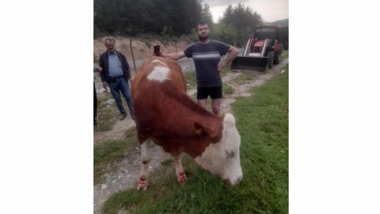 Kastamonu Araç'ta su kanalına düşen inek, köylülerin çabasıyla kurtarıldı.