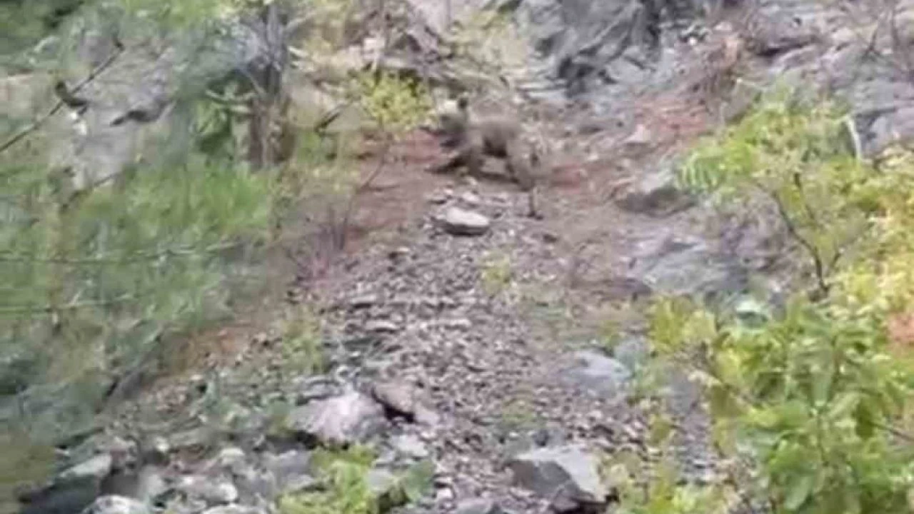 Karabük'te koşan ayı ile dağa tırmanan yavru ayı cep telefonu kameralarıyla görüntülendi.