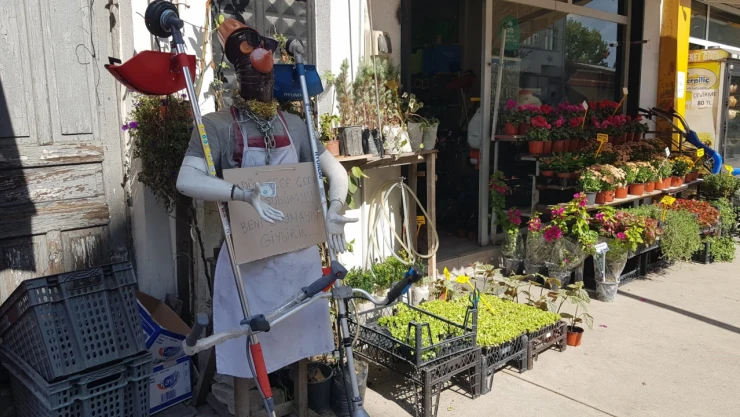 Hürriyet Mahallesi Aktaş Caddesi üzerinde tarım aletleri satan dükkanın sahibi Ömer İncebacak, sabah geldiği iş yerinin önünde duran cansız mankenin üzerindeki kıyafetlerin olmadığını fark etti.
