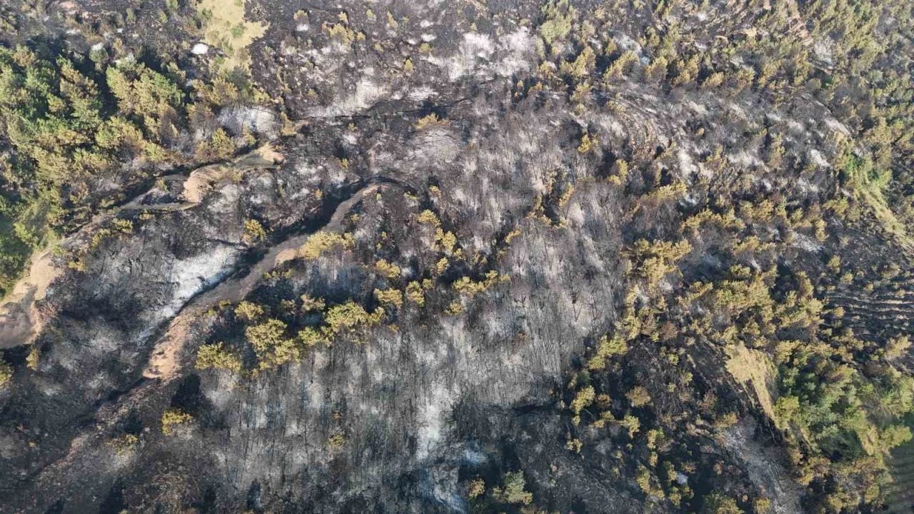 Yangının kontrol altına alınmasının ardından bölgede soğutma çalışmaları sürdürülürken yangında zarar gören alanlar dronla görüntülendi.