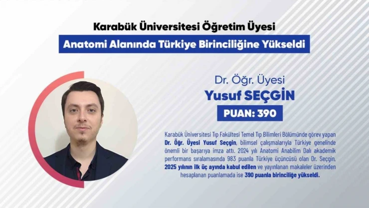 Karabük Üniversitesi Tıp Fakültesi Dr. Öğr. Üyesi Yusuf Seçgin, YÖKSİS’in 2025 yılı verilerine göre Anatomi alanında Türkiye birincisi oldu.