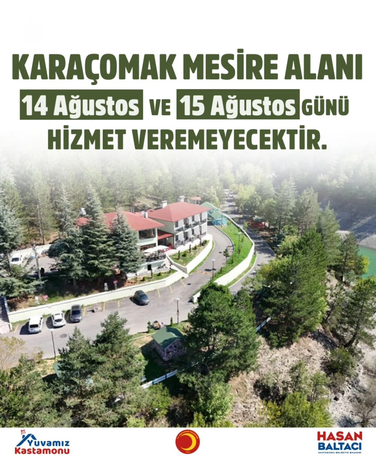 Kastamonu Belediyesi, orman yangınlarını önleme çalışmaları kapsamında Karaçomak Mesire Alanı'nın 14-15 Ağustos tarihlerinde kapalı olacağını duyurdu.