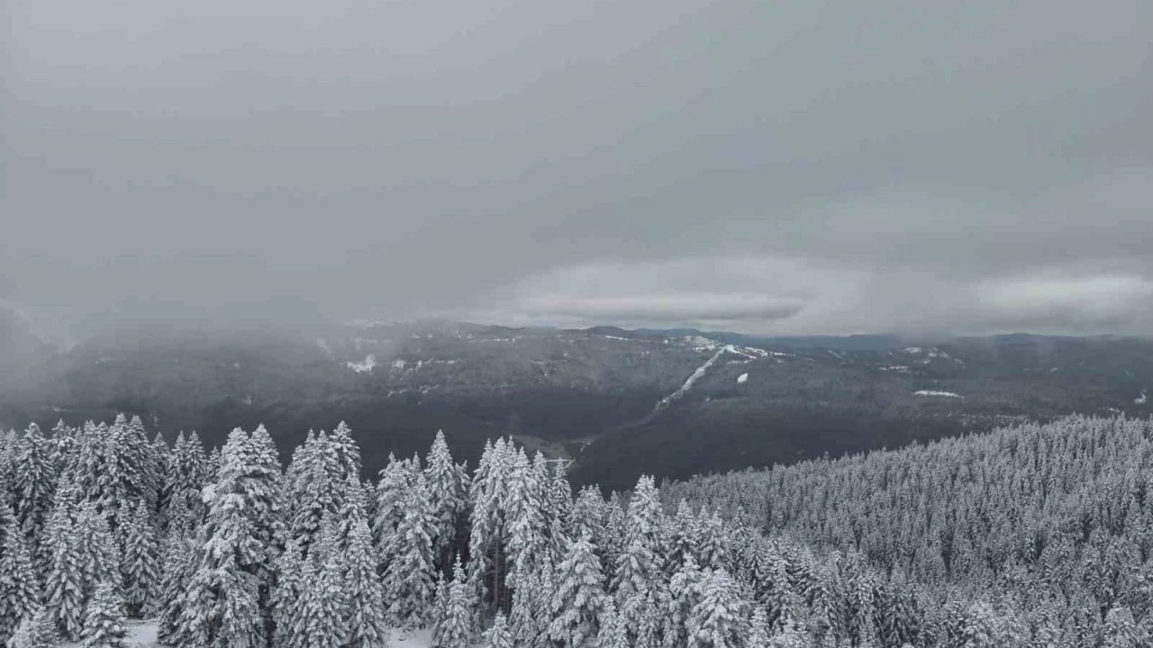 Kar yağışıyla beyaza bürünen Ilgaz Dağı, havadan görüntülendi.