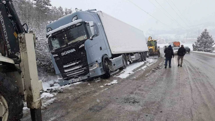 Bolu'nun Mudurnu ilçesi ile Ankara'nın Nallıhan ilçesini birbirine bağlayan karayolunda yoğun kar yağışı nedeniyle rampada kayan tır, şarampole devrildi. Yan yatan tır, bölgeye sevk edilen 2 iş makinesinin güçlükle yürüttüğü çalışma sonucu kurtarıldı.