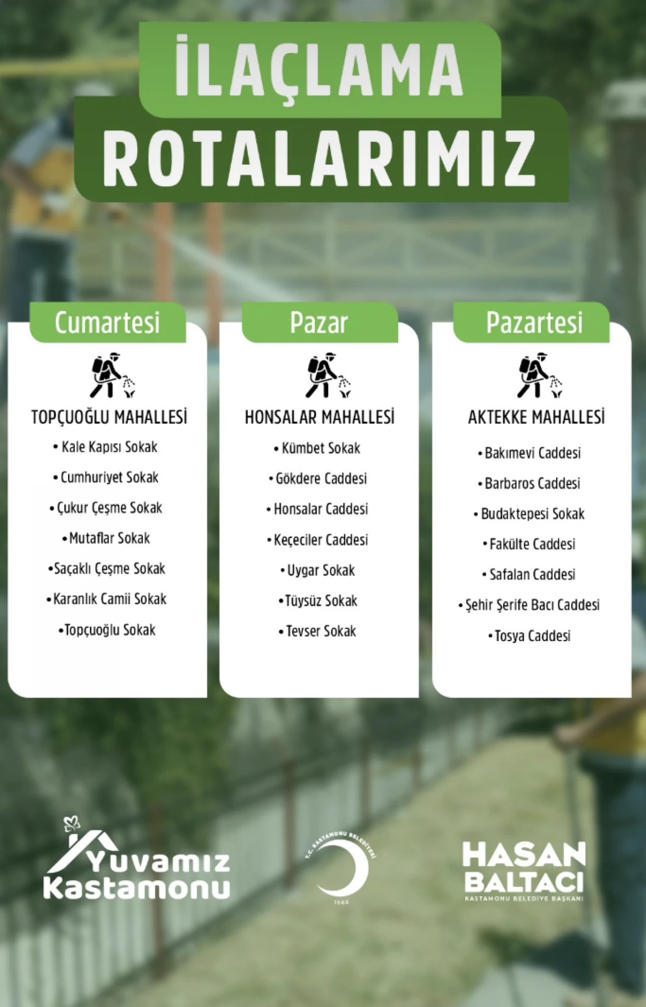 Kastamonu Belediyesi, şehir genelinde sivrisinek ve haşerelere karşı düzenli olarak yürüttüğü ilaçlama çalışmalarının programını açıkladı.