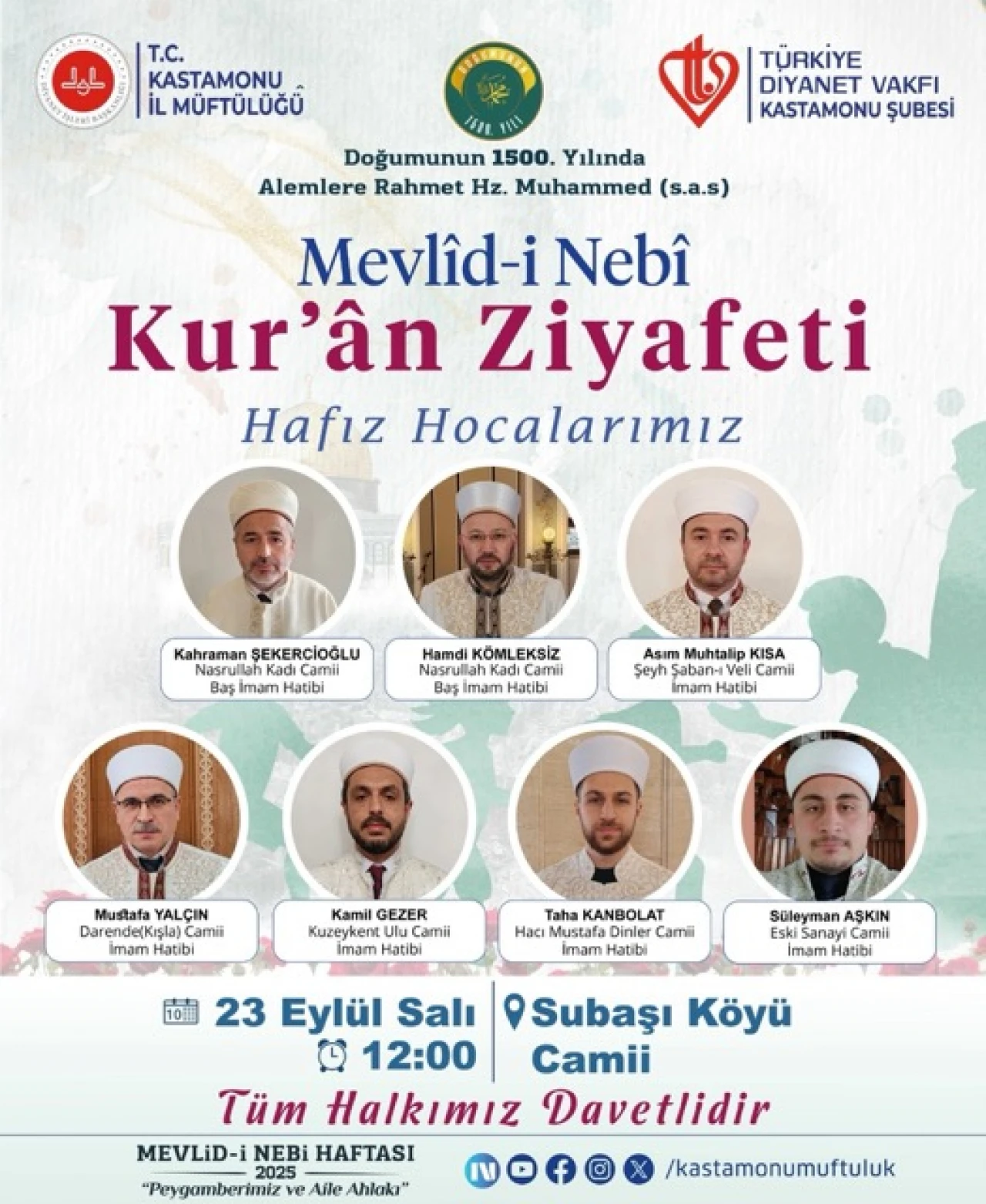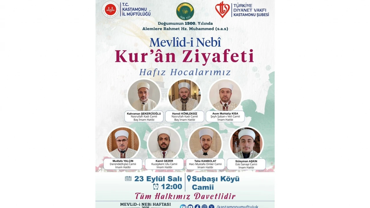 “Âlemlere Rahmet Hz. Muhammed (s.a.s.)’in doğumunun 1500. yılında düzenlenecek olan Mevlid-i Nebi Kur’an Ziyafetine tüm halkımız davetlidir. Gönüllerimizi Kur’an tilavetleriyle bereketlendirecek bu manevi buluşmaya siz değerli kardeşlerimizi bekliyoruz.”