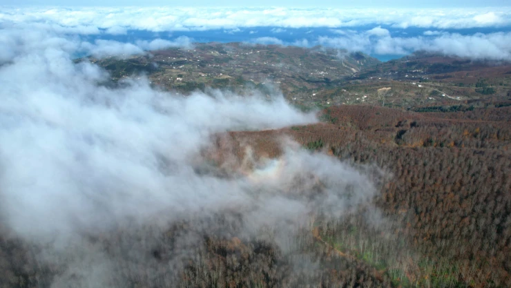 Arpalıkbaşı mevkisinde başlayan sis, yüksek rakımlara doğru yoğunlaşarak devam ediyor. Vadilere çöken sis, ormanlık alanlarla buluşunca doğada güzel görüntüler oluşturdu. Sisle bütünleşen kara yolu ve ormanlık alanlar, dron ile görüntülendi.