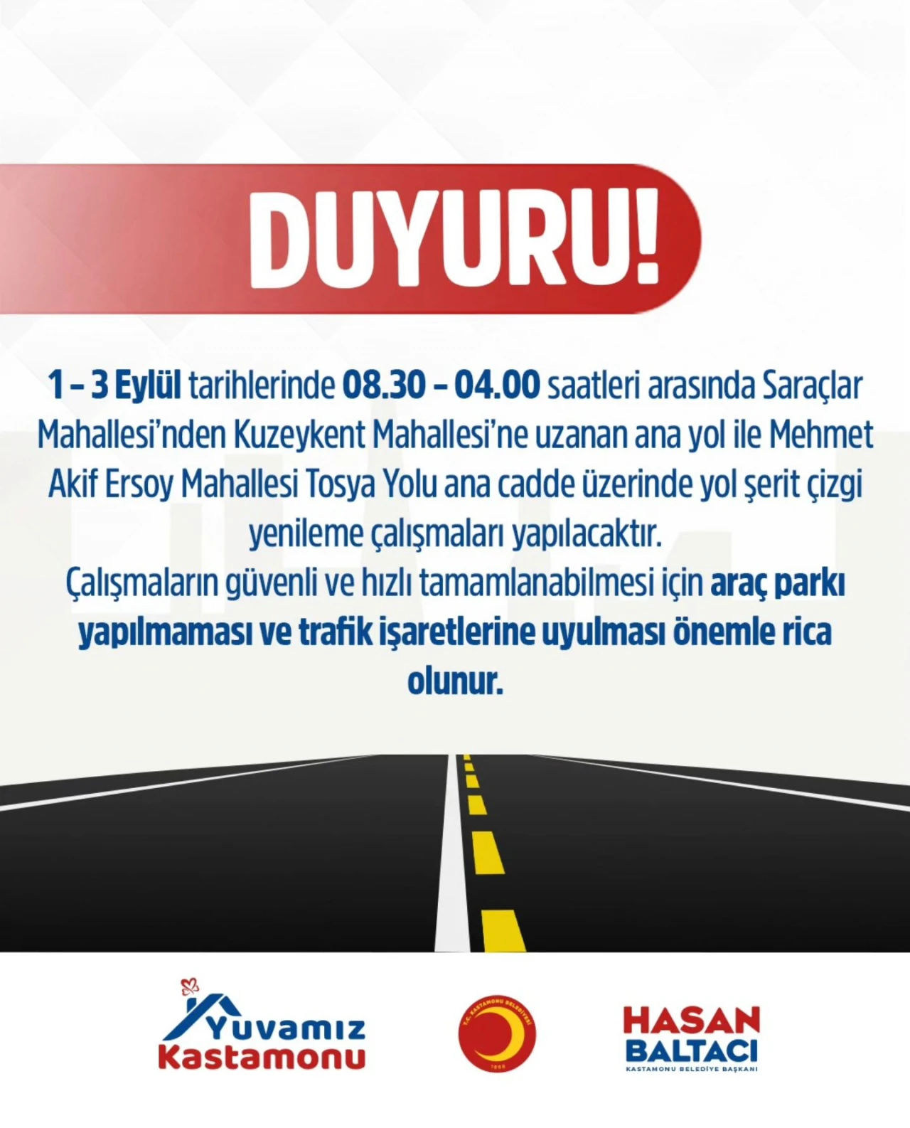 Kastamonu Belediyesi, şehir genelinde yol güvenliğini artırmaya yönelik çalışmalarını sürdürüyor. Belediye tarafından yapılan açıklamaya göre, 1 – 3 Eylül tarihleri arasında 08.30 – 04.00 saatleri arasında Saraçlar Mahallesi’nden Kuzeykent Mahallesi’ne uzanan ana yol ile Mehmet Akif Ersoy Mahallesi Tosya Yolu ana cadde üzerinde yol şerit çizgi yenileme çalışmaları gerçekleştirilecek.