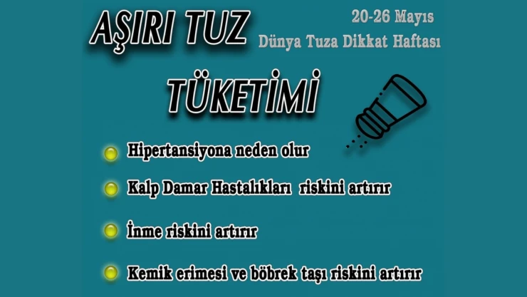 İl Sağlık Müdürlüğü tarafından yapılan bilgilendirmede; “Vücutta sıvı dengesinin ve dolayısıyla kan basıncının düzenlenmesinde, asit-baz dengesinin sağlanmasında ve sinir-kas sisteminde uyarıların iletilmesinde tuzun (NaCl) önemli görevleri bulunmaktadır. Aynı zamanda antiseptik özelliği de olan tuz, tümünü yok etmese de, nem miktarını büyük oranda düşürerek gıdaların bozulmasına neden olabilecek bakterilerin üremesini kontrol altında tutar; bu özelliğinden faydalanarak çeşitli gıdaların saklanmasında, koruyucu olarak kullanılır. Ancak aşırı miktarda tüketildiğinde birçok sağlık problemine neden olmakta ve insan sağlığını olumsuz etkileyen bir halk sağlığı problemine dönüşmektedir. Dünyada ölümlerin yarıdan fazlasına bulaşıcı olmayan hastalıklar neden olurken; bunların yüzde 30’unu kalp-damar hastalıkları oluşturmaktadır. Bu hastalıklar için en önemli değiştirilebilir risk faktörleri; aşırı tuz tüketimini de kapsayan sağlıksız beslenme, fiziksel aktivite yetersizliği, sigara kullanımı ve alkol kullanımıdır” denildi.