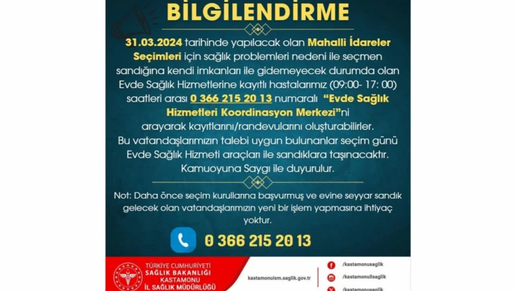 İl Sağlık Müdürlüğü’nden yapılan duyuruda; “31 Mart 2024 tarihinde yapılacak olan Mahalli İdareler Seçimleri için sağlık problemleri nedeni ile seçmen sandığına kendi imkanları ile gidemeyecek durumda olan Evde Sağlık Hizmetlerine kayıtlı hastalarımız (09.00-17.00) saatleri arası 0 366 215 20 13 numaralı Evde Sağlık Hizmetleri Koordinasyon Merkezi’ni arayarak kayıtlarını/randevularını oluşturabilirler. Bu vatandaşlarımızın talebi uygun bulunanlar seçim günü Evde Sağlık Hizmeti araçları ile sandıklara taşınacaktır. Daha önce seçim kurullarına başvurmuş ve evine seyyar sandık gelecek olan vatandaşlarımızın yeni bir işlem yapmasına ihtiyaç yoktur” denildi.
