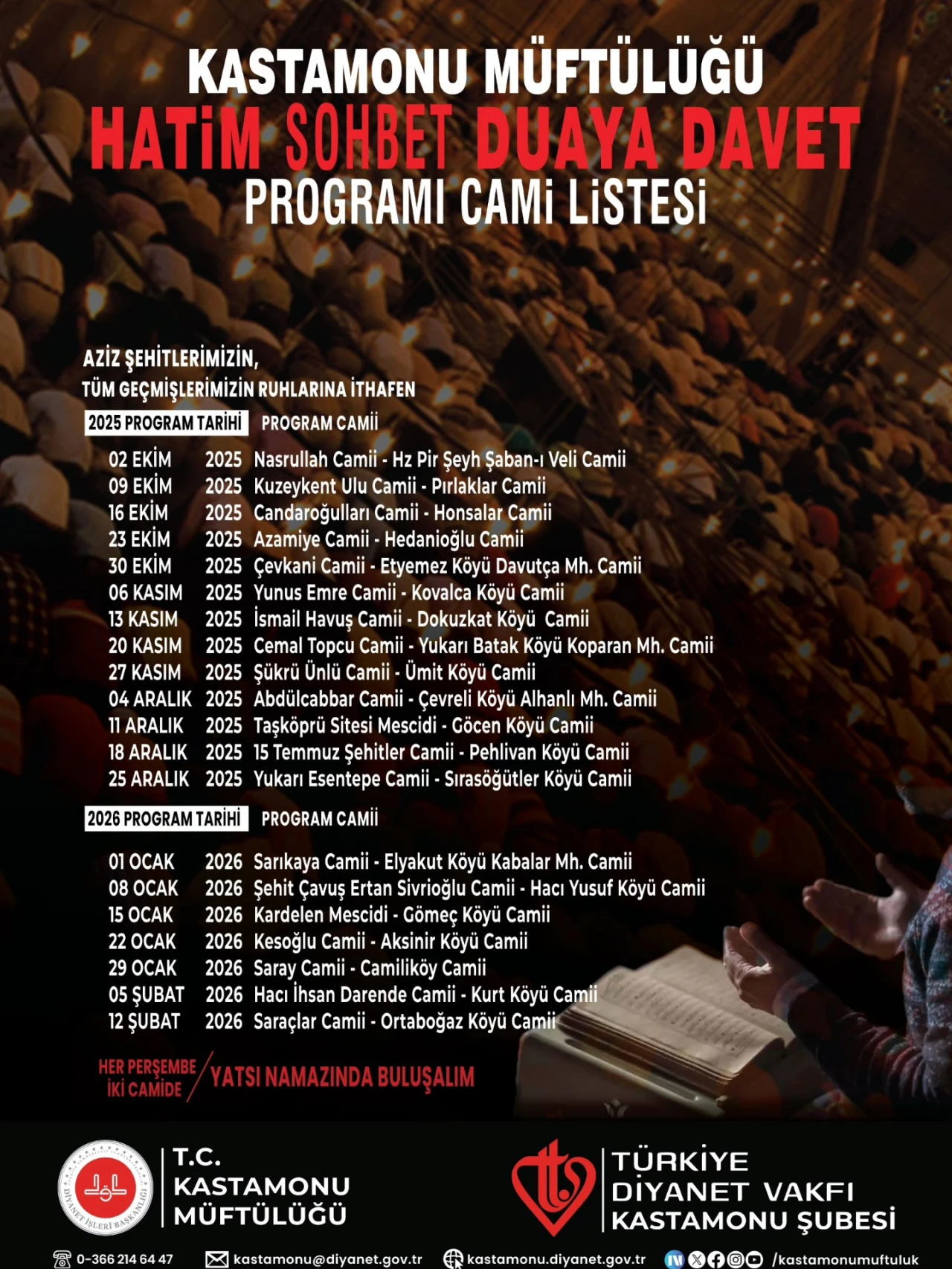 Kastamonu Müftülüğü, şehir genelinde düzenlenecek 'Hatim, Sohbet ve Dua Programı'nın takvimini açıkladı.