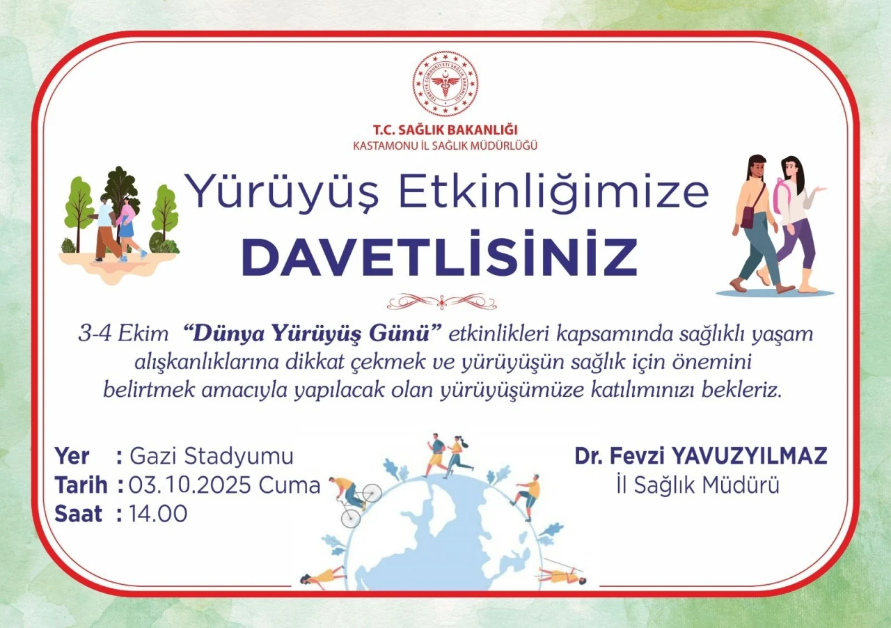 Kastamonu'da sağlıklı yaşam bilincinin toplumda yaygınlaştırılması, düzenli fiziksel aktivitenin öneminin vurgulanması ve obezite başta olmak üzere kronik hastalıklarla mücadelenin güçlendirilmesi ve toplumsal farkındalık oluşturulması amacıyla Kastamonu Gazi Stadyumu’nda Cuma günü saat 14:00'da yürüyüş düzenlenecek.