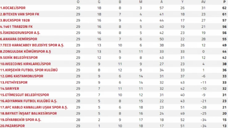 TFF 2'nci Lig Kırmızı Grup'ta 29'uncu hafta tamamlandı. GMG Kastamonuspor 29 haftanın sonunda 12'nci sırada yer alıyor.