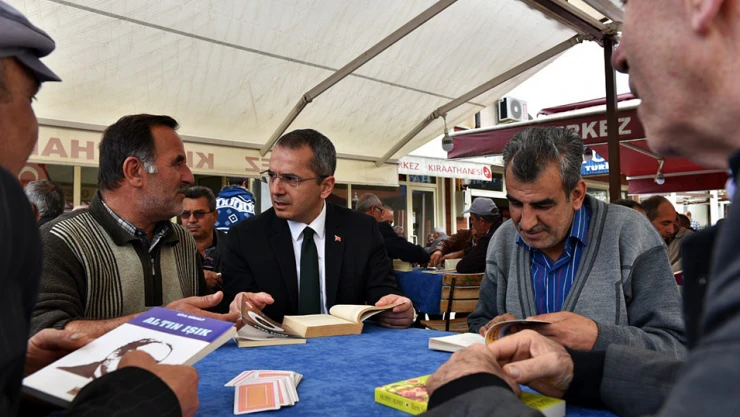 Tosya Kaymakamı Deniz Pişkin’in ‘Kütüphanesiz Okul, Kitapsız Öğrenci Kalmasın’ sloganı ile kahvehanelerde okey oynayanların masalarına oturup kitap okudu. Tosya'da ilçenin kitap okuma oranını arttırmak için harekete geçen Kaymakam Deniz Pişkin’in ‘Okuyan Tosya Hayalim Var’ sloganıyla yaklaşık bir ay önce kitap okuma seferberliği başlatmıştı. Bu kapsamda kahvehanelere de el atan Kaymakam Pişkin, okey oynayan vatandaşların masasına oturarak kitap okudu. Kaymakam Pişkin'in projesine destek veren vatandaşlar da okey masalarında kitap okumaya başladı. “KAHVEHANELERİ KIRAATHANEYE ÇEVİRECEĞİZ” Proje hakkında bilgi veren Tosya Kaymakamı Deniz Pişkin; “Kısa bir zaman önce ilçe genelinde başlatmış olduğumuz Kütüphanesiz okul kitapsız öğrenci kalmasın kampanyası çerçevesinde sadece sabahları okuma saatlerine okullara uğrayarak değil akşamları ve gündüzleri kahvehanelere giderek oralarda vatandaşlarımızla kitap okuyacağız demiştik. Bugün bunun ilk olarak ilçenin en büyük kahvehanesinde başlattık. Kahvehaneye girdiğimiz zaman vatandaşlarımız önce yadırgasa da daha sonra oyunlarını bırakarak bizlerle 15 dakika kitap okudu. Bildiğiniz gibi kahvehaneler özünde kıraathane bizler tekrar özüne döndüreceğiz” dedi. “KİTAP OKUMAK İSTERİZ” Kaymakam Deniz Pişkin’e destek veren vatandaşlar ise; “Bizler Kaymakam Bey'in okullara giderek kitap okuma kampanyasını basından okuyarak takip ediyorduk. Fakat Kaymakam Bey'in kahvehanemize gelerek bizleri de bu kampanyaya katılmaya teşvik etmesi bizleri çok mutlu etti. Bizler de kahvehanelerde okuma köşelerinin kurularak buralarda diğer zamanlarımızda kitap okumak isteriz. Kaymakam Deniz Pişkin’in okuma kampanyasına destek veriyoruz” dediler. Kaymakam Deniz Pişkin’in Kahvehane ziyaretine Jandarma Komutanı Özgün Yapağı, İlçe Emniyet Müdürü Kazım Ejder katıldı.