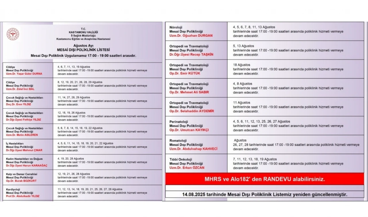 Kastamonu Eğitim ve Araştırma Hastanesi, Ağustos ayı için mesai dışı poliklinik listesini güncelledi.