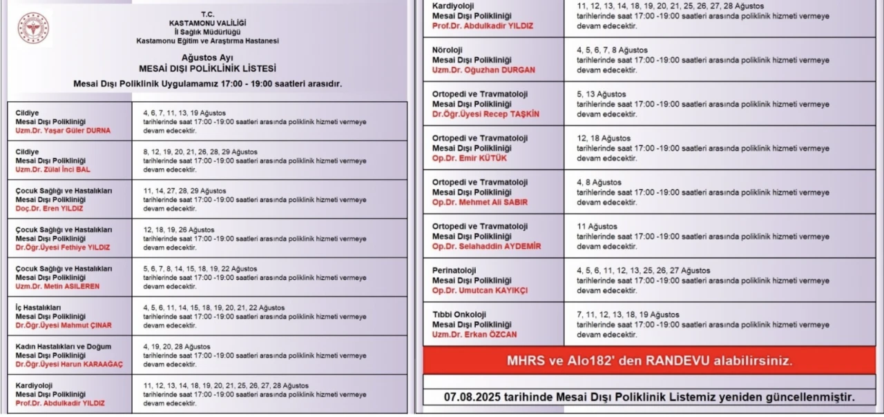 Kastamonu Eğitim ve Araştırma Hastanesi, vatandaşların sağlık hizmetlerine daha kolay erişebilmesi amacıyla Ağustos ayı mesai dışı poliklinik listesini güncelledi.