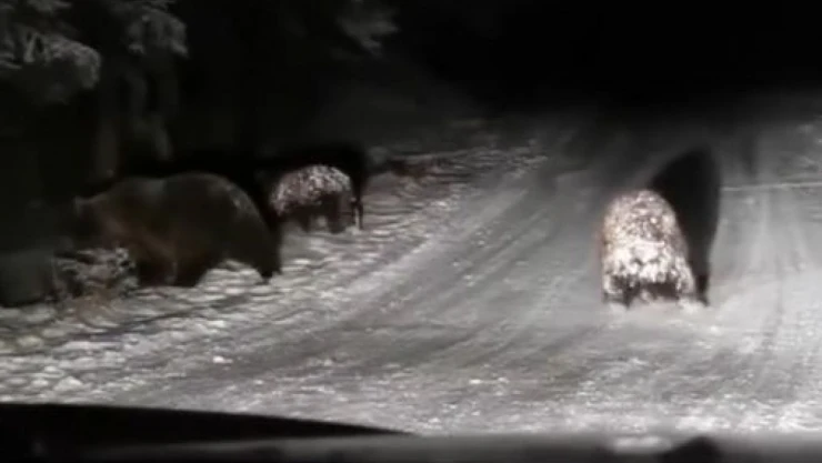 Bolu’nun Gerede ilçesine bağlı Demirler Köyü mevkiinde, gece yarısı aracıyla seyir halinde olan Sinan Ceylan, yol üzerinde ayılarla karşılaştı. Karla kaplı yolda 3 ayının oyun oynadığını gören Ceylan, ayıların sevimli anlarını telefonuyla kayda aldı. Kış uykusuna yatmayan ayılar karlı yolda bir süre oynadıktan daha sonra ormanlık alana doğru kaçtığı görüldü.