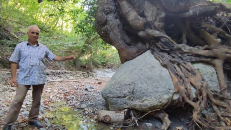 Selle birlikte 300 yıllık çınar ağacının köklerinin dışarıya çıktığını ve 2 tonluk kayayı sarmaladığı görüntünün ortaya çıktığını anlatan köy sakinlerinden Aydın Saraç, "Son yağmurlarda selin yaptığı tahribatı görüyorsunuz. Bir taşın üzerindeki bizim kavlak ağacı dediğimiz asıl adı Çınar olan ağacın köklerinin nasıl dışarıya çıktığını görüyoruz. Daha önceden kayanın üzerinde biten ağaç orada yetişip büyürken toprak altındaki kayayı nasıl sarmaladığını, beraber yaşadığını anlayabiliyoruz. Aslında bir taşla ağacın ortak bir yaşamı ortak yaşayabildiklerinin bir kanıtı. Selle birlikte toprak kaysa bile ağacın kökleri, sarmaladığı kayayı tutmaya devam ediyor. Bu ağacın yaklaşık 200-300 yaşında olduğunu tahmin ediyoruz. Taşta bir metreye 2 metre gibi boyutlarında. Yaklaşık 1 metre de yüksekliği var. Yaklaşık 2 veya 3 ton ağırlığında vardır. Bu sel bunların ikisini ortaya çıkarmış. Her yerde rastlanamayacak ilginç bir görüntü. Fasulyelere sırık yapmaya geldiğim zaman bu ilginç görüntü ile karşılaştım. Hemen fotoğrafladım" diye konuştu.