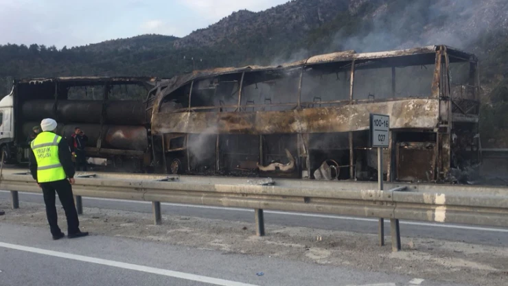 Çorum’un Osmancık ilçesinde emniyet şeridinde park halinde bulunan Gürcistan uyruklu LT 640 TL plakalı TIR’a bir yolcu otobüsünün çarpması sonucu meydana gelen trafik kazasında 13 kişi hayatını kaybederken 20 kişide yaralandı. Kaza, Tosya-Osmancık karayolunda meydana geldi. Edinilen bilgilere göre; İstanbul’dan Tokat’a gittiği öğrenilen yolcu otobüsü Kesikkaya bölgesinde arızalanan çelik yüklü TIR’a arkadan çarptı. Çarpışmanın etkisiyle yolcu otobüsü ve TIR alev aldı. Bir anda büyüyen alevler yolcu otobüsünü sardı. Kazayı gören sürücüler polis ve jandarma ekiplerini arayarak yardım istedi. İhbar üzerine bölgeye çok sayıda polis, itfaiye, jandarma ekiplerinin yanı sıra çok sayıda ambulans sevk edildi. Kazada yolcu otobüsü tamamen TIR’ın ise dorse kısmı yandı. Yanan araçlara müdahale eden itfaiye ekipleri yangını kısa sürede kontrol altına aldı. Yaralılar Osmancık Devlet Hastanesi ile Erol Olçok Eğitim ve Araştırma Hastanelerine kaldırılarak tedavi altına alındı. Otobüsün tamamen yanması nedeniyle ölü ve yaralı sayısının belirlenmesi konusunda güçlük yaşandığı belirtildi. Olay yerine sevk edilen çok sayıda ekip çalışmalarını sürdürüyor. OLAY YERİNİ İNCELEDİLER Kazanın duyulmasının ardından Çorum Valisi Necmettin Kılıç, İl Jandarma Komutanı Albay Abdurrahman Başbuğ, İl Emniyet Müdürü Murat Kolcu, Osmancık Belediye Başkanı Hamza Karataş ve Osmancık Kaymakam Vekili Emre Çiftci ile olay yerine gelerek kazayla ilgili bilgi aldı. İl Sağlık Müdürü Ömer Sobacı da Osmancık Devlet Hastanesi’ne giderek, yaralıların sağlık durumları hakkında bilgi aldı. Bu arada kazayla ilgili Çorum Valiliği'nden yapılan yazılı açıklamada: “İstanbul-Samsun D100 kara yolunda saat 05.35 sıralarında Tosya-Osmancık istikametine doğru yolun emniyet şeridine park etmiş haldeki tıra yolcu otobüsünün arkadan çarpması sonucu ölümlü, yaralamalı ve maddi hasarlı trafik kazası meydana gelmiştir. Olayla ilgili adli soruşturma devam etmekte olup soruşturmanın tamamlanmasına müteakiben diğer gelişmeler paylaşılacaktır” denildi. YARALANANLARIN İSİMLERİ Osmancık Devlet Hastanesi'ne kaldırılarak tedavi altına alınan yaralıların isimle şunlar; Hiranur Güngör, Nesrin Özçiftçi, Emrah Demir, Zehre Turan, Hediye Kuriyeva, Fazilet Karayaz, Fatma Akarsu, Fındık Karatağ, Musa Çoşkun, Emine Güngör, İzzet Gül, Gülten Kafadar, Mehmet Şerif, İlknur Döner, Arzu Uslu, Kerime Turan, Hulusi Kaplan, Serhat Varol, Dursun Koca ve Mürsel Çakır. Bu yaralılardan bir kısmının ileri tetkik ve tedavi için Hitit Üniversitesi Erol Olçok Eğitim ve Araştırma Hastanesi’ne sevk edildiği bildirildi.