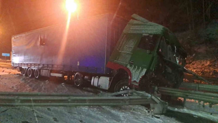Bolu-Mengen karayolunda Dorukhan Tüneli çıkışında kontrolden çıkan tır refüjedeki bariyerlere çarptı.