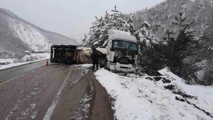 Bolu'da kar yağışı sebebiyle kontrolden çıkan soda yüklü tır, devrildi.