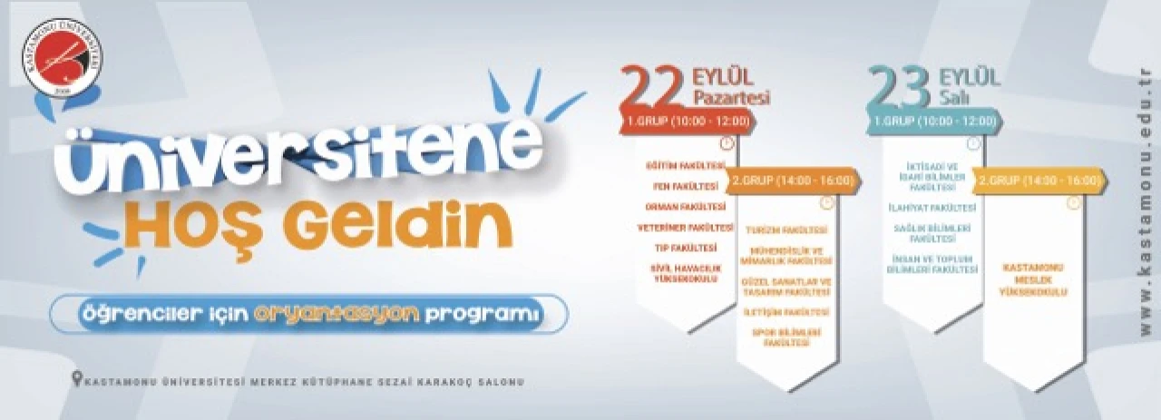 22 Eylül Pazartesi günü 10.00-12.00 arası Eğitim Fakültesi, Fen Fakültesi, Orman Fakültesi, Veteriner Fakültesi, Tıp Fakültesi, Sivil Havacılık Yüksekokulu; saat 14.00-16.00 arası Turizm Fakültesi, Mühendislik ve Mimarlık Fakültesi, Güzel Sanatlar ve Tasarım Fakültesi, İletişim Fakültesi, Spor Bilimleri Fakültesi; 23 Eylül Salı günü saat 10.00-12.00 arası İktisadi ve İdari Bilimler Fakültesi, İlahiyat Fakültesi, Sağlık Bilimleri Fakültesi, İnsan ve Toplum Bilimleri Fakültesi, saat 14.00-16.00 Kastamonu Meslek Yüksekokulu öğrencileri Kastamonu Üniversitesi Merkez Kütüphane Sezai Karakoç Salonu’nda oryantasyon programına alınacak.