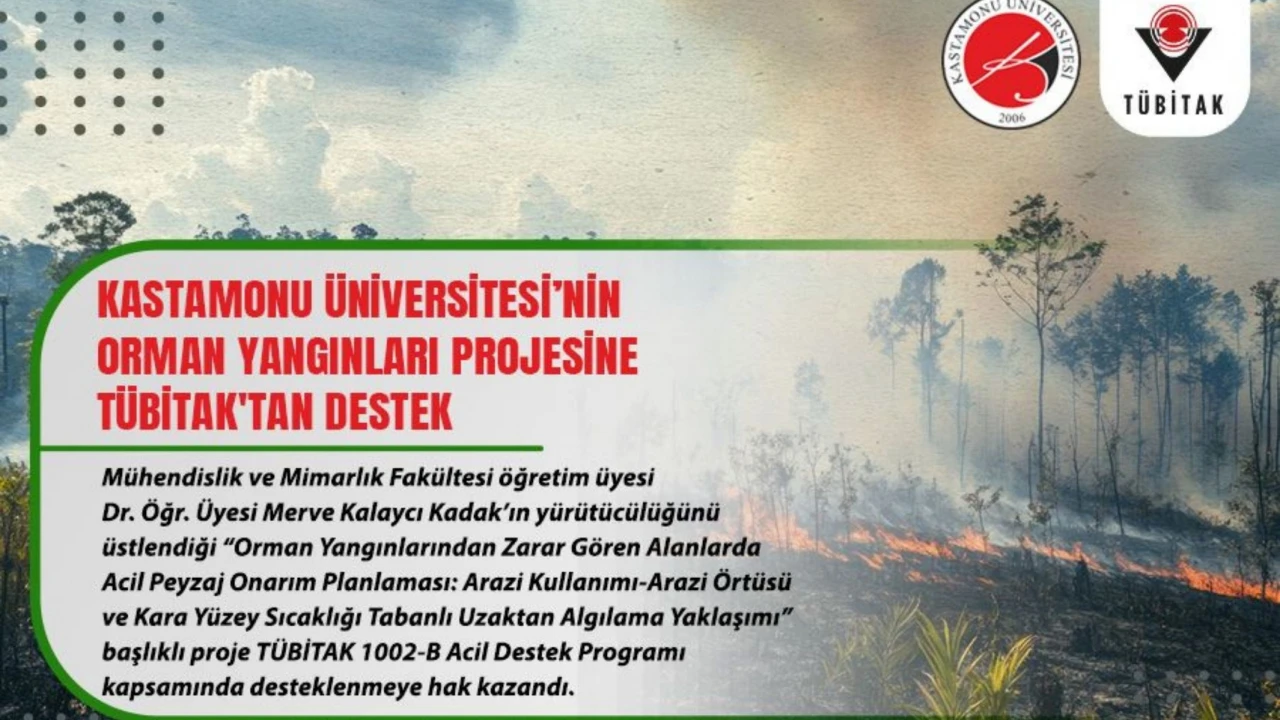 Kastamonu Üniversitesi Mühendislik ve Mimarlık Fakültesi öğretim üyesi Dr. Öğr. Üyesi Merve Kalaycı Kadak’ın yürütücülüğünü üstlendiği “Orman Yangınlarından Zarar Gören Alanlarda Acil Peyzaj Onarım Planlaması: Arazi Kullanımı-Arazi Örtüsü ve Kara Yüzey Sıcaklığı Tabanlı Uzaktan Algılama Yaklaşımı” başlıklı proje TÜBİTAK 1002-B Acil Destek Programı kapsamında desteklenmeye hak kazandı.
