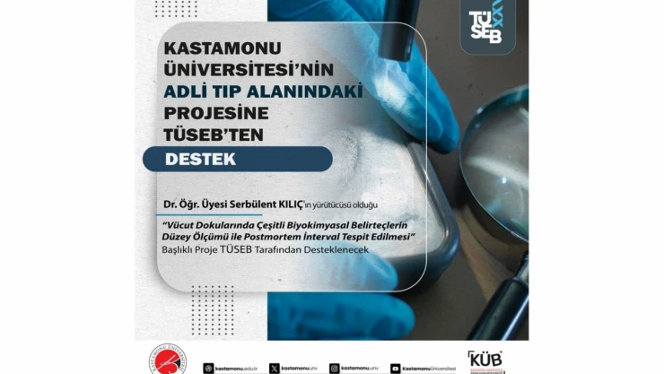 Kastamonu Üniversitesi Tıp Fakültesi Adli Tıp Ana Bilim Dalı Dr. Öğr. Üyesi Serbülent Kılıç’ın yürütücülüğünü yaptığı Dr. Öğr. Üyesi Uğur Akpulat, Doç. Dr. İrfan Çınar ve Dr. Öğr. Üyesi Nurtaç Sarıkaş’ın araştırmacı olarak görev aldığı “Vücut Dokularında Çeşitli Biyokimyasal Belirteçlerin Düzey Ölçümü ile Postmortem İnterval Tespit Edilmesi” projesi, Türkiye Sağlık Enstitüleri Başkanlığı (TÜSEB) tarafından desteklendi.