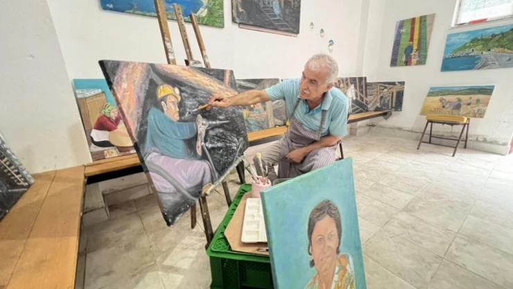 Halit Kaya, konuya ilişkin açıklamalarında; “Ben 68 yaşındayım, eskiden bizim zamanlarımızda böyle resim olaylarına pek değer verilmezdi. Madenden emekli olduktan sonra heves ettim. Halk Eğitimde kurs aldım. Amatör olarak başladığım hobi mesleğinde profesyonel olarak tuvale hislerimi aktarmaya başladım. Eşim korona döneminde kaybettikten sonra uzun bir ara ressamlık yapmadım, daha sonra kendimi çizim yapmaya tuvalleri renklendirme başladım. Eşimin portresini tuvale yağlı boya ile çizdim. Ben madenci torunuyum. Bölgemizde kısa zamanlarda madenci şehitleri olduğu için kendimi madencilerimizi kahramanlarımızı yağlı boya ile resimlerini yapmaya başladım. Bir vefa borcu olarak gördüğüm için madencilerimiz ile alakalı resimlerimi müzelerde kahramanlarımızı farklı illerde tanıtarak sergi yapmayı çok istiyorum. Ben ressamlıktan arta kalan zamanlarımda ise el emeği ürünler yaparak vakit geçiriyorum” dedi.