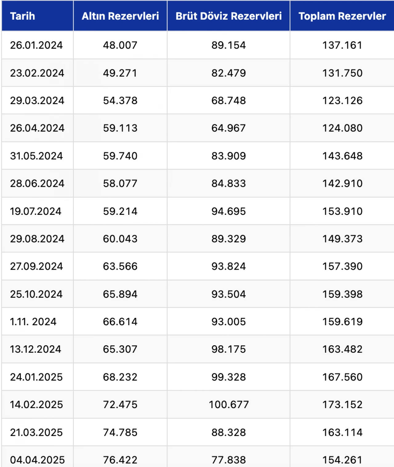 TCMB rezervleri, Ocak 2024'ten bu yana şöyle (milyon dolar):