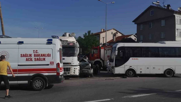 Bolu'da midibüsle çarpışan otomobil, midibüs ve kamyonun arasında kağıt gibi ezildi. Meydana gelen kazada otomobil sürücüsü yaralandı.