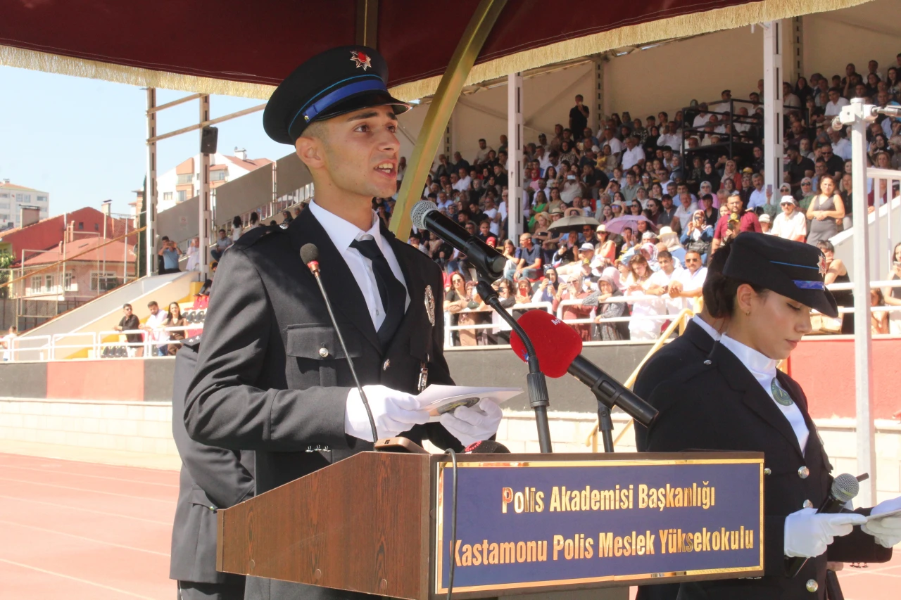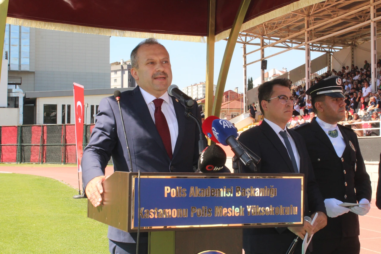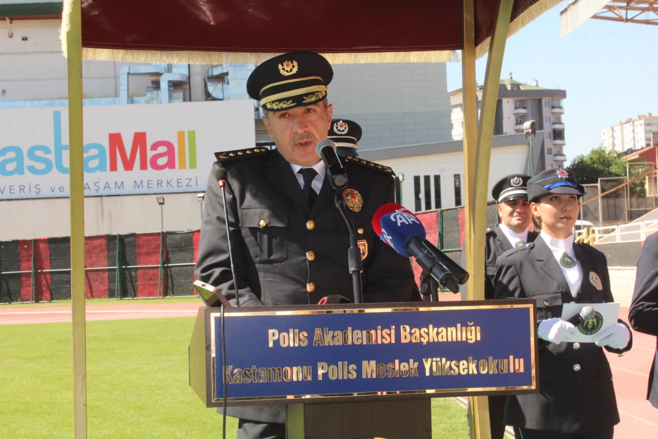 Yaptıkları törenin sadece mezuniyet töreni olmadığını söyleyen Kastamonu Polis Meslek Yüksekokulu Müdürü 1. Sınıf Emniyet Müdürü Mehmet Yüksel; “Bugün burada, ülkemizin dört bir yanında görev yapacak olan 486 yeni polisimizi uğurlamak üzere toplandık. Bu sadece bir mezuniyet değil; aynı zamanda bir yemin, bir görev ve bir millete hizmet sözüdür. Evlatlarımız zorlu bir eğitim sürecinde sadece akademik bilgiyle değil, ahlaki değerlerle, disiplinle, sorumluluk bilinciyle donandılar. Artık sadece öğrenci değil; milletimizin huzuru, güvenliği ve geleceği için mücadele edecek olan birer Türk polisidirler. Bu noktada ailelerimize de ayrı bir teşekkür etmek istiyorum. Büyük emekler sarf ederek yetiştirip büyüttüğünüz evlatlarınızı bize emanet ettiniz, onların bu kutsal mesleğe adım atmasında en büyük katkı size aittir. Onlarla ne kadar gurur duysanız azdır. Sevgili genç meslektaşlarım; göreviniz neresi olursa olsun bu okulda kazandığınız değerler daima sizinle olacak. Ne olursa olsun dürüstlükten ve adaletten ödün vermeyiniz. Rehberiniz vicdanınız, dayanağınız hukuk, sancağınız ise ay yıldızlı bayrağımız olsun. Kendinize başkaca bir mihmandar belirlemeyiniz. Hepiniz asil birer sancaksınız, daima dik durun, bayrağı hiçbir şahsi çıkarla lekelemeyin. Bugün mezun oluyorsunuz. Emniyet Teşkilatının bir üyesi olarak yüklendiğiniz sorumluluğun bilincinde, devletin temsilcisi, vatanımızın ve huzurumuzun koruyucusu olduğunuzu unutmayınız. Vatan uğruna can veren aziz şehitlerimizi rahmetle, gazilerimizi minnetle anıyor; mezun olan tüm öğrencilerimize başarılarla dolu bir hayat diliyorum. Yolunuz ve bahtınız açık olsun. Hepinizi sevgi ve saygıyla selamlıyorum” dedi.
