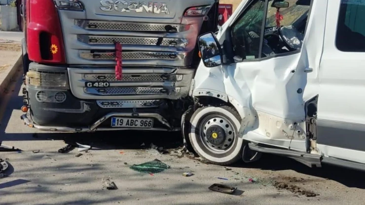Çorum'da işçileri taşıyan servis minibüsünün otomobil ve tıra çarptığı kazada, 14 kişi yaralandı.