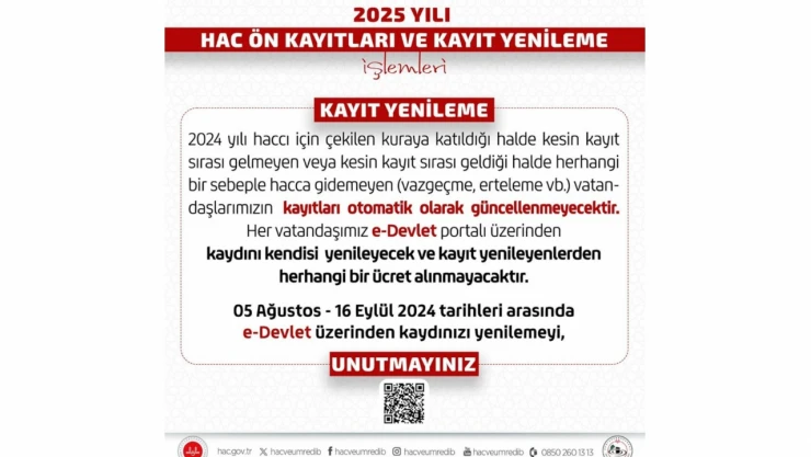İl Müftülüğü’nden yapılan bilgilendirmede; “2024 yılı haccı için çekilen kuraya katıldığı halde kesin kayıt sırası gelmeyen veya kesin kayıt sırası geldiği halde herhangi bir sebeple hacca gidemeyen (vazgeçme, erteleme vb.) vatandaşlarımızın kayıtları otomatik olarak güncellenmeyecektir. Her vatandaşımız e-Devlet portalı üzerinden kaydını kendisi yenileyecek ve kayıt yenileyenlerden herhangi bir ücret alınmayacaktır. 5 Ağustos-16 Eylül 2024 tarihleri arasında e-Devlet üzerinden kaydınızı yenilemeyi unutmayınız” denildi.