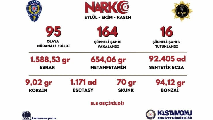 Kastamonu İl Emniyet Müdürlüğü Narkotik Suçlarla Mücadele Şube Müdürlüğü tarafından 3 ay içinde 95 olaya müdahale edildi. Müdahale edilen olaylarda 164 şüpheli şahıs yakalanırken, şüpheli şahıslardan 16’sı tutuklandı. Gerçekleştirilen çalışmalarda bin 588,53 gram esrar, 654,06 gram metamfetamin, 92 bin 405 adet sentetik ecza, 9,02 gram kokain, bin 171 esctasy, 70 gram skunk ve 94,12 gram bonzai ele geçirildi.