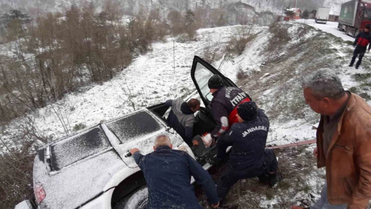 Bolu'nun Mudurnu ilçesinde kar sebebiyle direksiyon hakimiyetini kaybeden sürücü, aracıyla şarampole devrildi.
