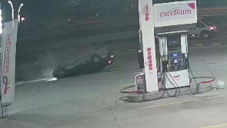 Karabük'te bir otomobilin akaryakıt istasyonuna girmeye çalıştığı sırada önce otomobile sonra kaldırıma çarparak ters döndüğü anlar güvenlik kamerasına yansıdı.