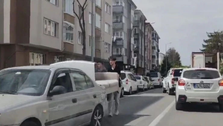 Bolu’da Bahçelievler Mahallesi’nde 3 kişinin koltuğu taşımak için bulduğu yöntem dikkat çekti. Koltuk taşımak isteyen 3 vatandaş otomobilin bagajına koltuğun bir kısmı koydu. 3 kişiden biri aracın direksiyonuna, diğer 2’si ise arkadan koltuğu tutmaya geçti. Bahçelievler Mahallesi’nde o şekilde koltuğu taşıyan vatandaşların ilginç yönetimi dikkat çekti. Muzaffer Işın Caddesi üzerinde metrelerce koltuğu taşıyan kişiler, vatandaş kamerasına yansıdı.