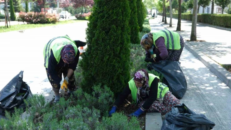 Bolu'da kadın temizlik personelleri park, bahçe ve yeşil alanlarda bahar temizliği yapıyor.