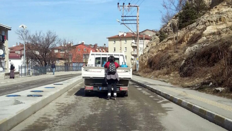 İlimizde patenle kayan genç kız, arkasında seyreden araçlara aldırmadan bir kamyonetin arkasına tutunarak yolculuk etti. Kastamonu Bakımevi Caddesi üzerinde yanından geçen ve arkasında seyreden araçlara aldırış etmeden paten kayan genç kız, kamyonetin arkasına takılarak yolculuk etti. Bir süre kamyonetin arkasında yolculuk yapan genç kız, kamyonetin yavaşlayarak dönmek için manevra yaptığı esnada kamyoneti bırakarak hiçbir şey olmamış gibi yoluna devam etti. Bu tehlikeli yolculuk, kamyonetin arkasında seyreden vatandaşlar tarafından cep telefonuyla görüntülendi.