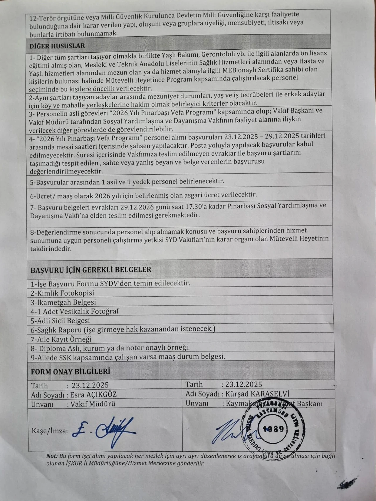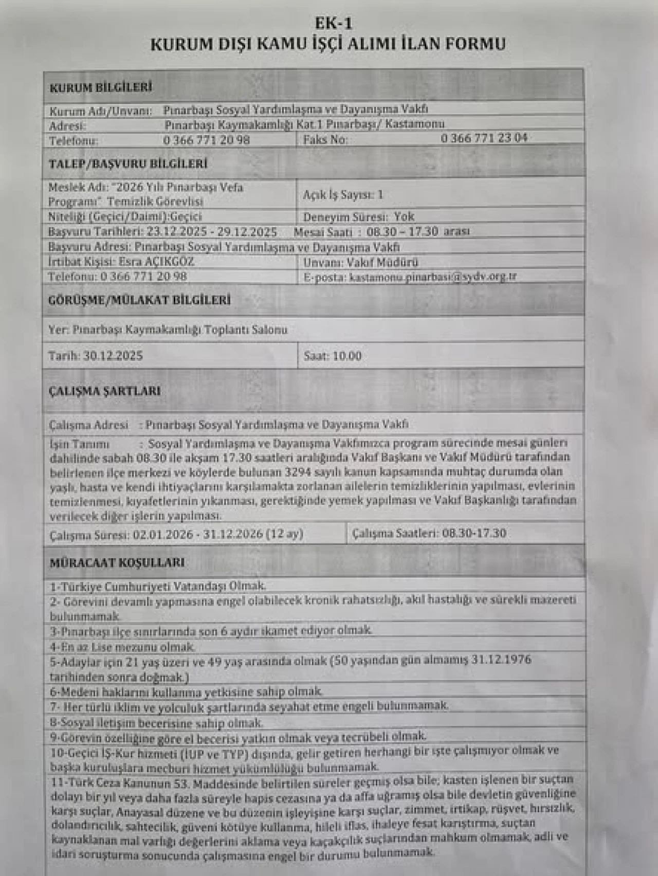 Pınarbaşı Sosyal Yardımlaşma ve Dayanışma Vakfı Başkanlığında, 2026 yılı Vefa Programı kapsamında çalışmak üzere 1 adet geçici temizlik görevlisi alımı yapılacak.