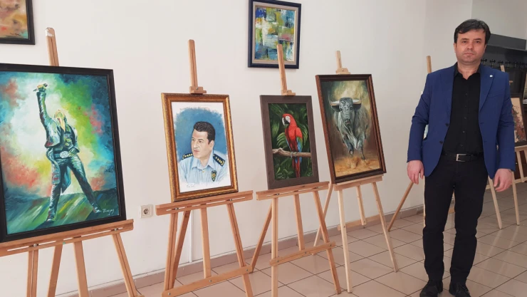 Karabük'te, 21 yıllık polis memuru Turgay Tiryaki yağlı boya çalışmalarını sergiledi.