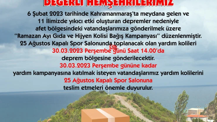 İnebolu Belediye Başkanlığı tarafından yapılan yardım duyurusunda; “6 Şubat 2023 tarihinde Kahramanmaraş'ta meydana gelen ve 11 İlimizde yıkıcı etki oluşturan depremler nedeniyle afet bölgesindeki vatandaşlarımıza gönderilmek üzere ‘Ramazan Ayı Gıda ve Hijyen Kolisi Bağış Kampanyası’ düzenlenmiştir. 25 Ağustos Kapalı Spor Salonu’nda toplanacak olan yardım kolileri 30 Mart 2023 Perşembe Saat 14.00'da deprem bölgesine gönderilecektir. 30 Mart 2023 Perşembe gününe kadar yardım kampanyasına katılmak isteyen vatandaşlarımız yardım kolilerini 25 Ağustos Kapalı Spor Salonu’na teslim etmeleri önemle duyurulur” denildi.