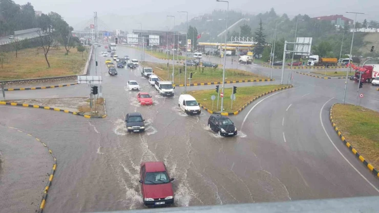 Karabük'te etkili olan sağanak yağmur sonrası göle dönen yollarda sürücüler zor anlar yaşadı.