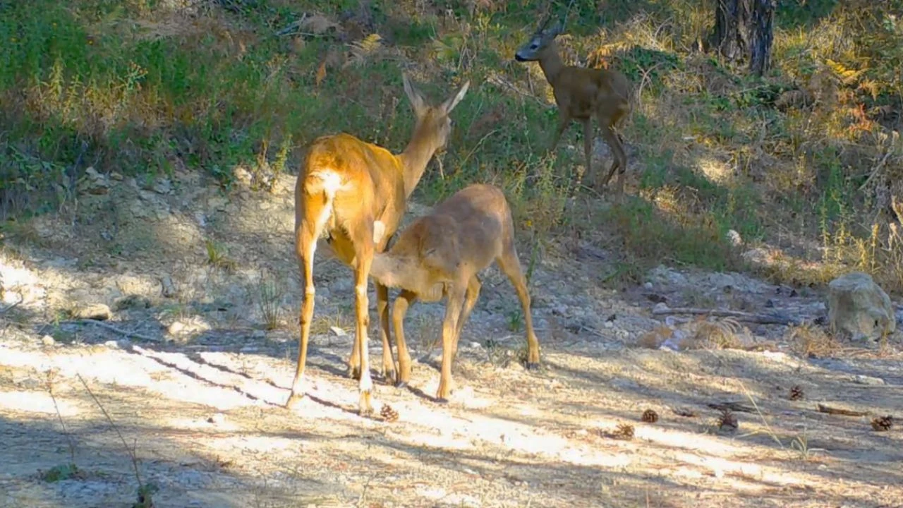 Doğa tutkunu Ömer Faruk Korkmaz, doğa gözlemi amacıyla ormanlık alana fotokapan yerleştirdi. Bölgede yiyecek arayan karaca ve boz ayının yavrularıyla birlikte gezdiği anlar kayda alındı. Görüntülerde yaban hayvanlarının yiyecek aradığı ve karacanın yavrusunu emzirdiği anlar yer aldı.